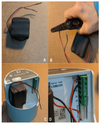 stripper (Image B). Place Battery into battery holder (C). Install the new battery using the red positive lead which should be fastened to the top Sensor terminal, and the black negative lead should be fastened to the second terminal below the red(Image D). It is important to prevent the red and black leads from making contact with each other during this process. After connecting power, wait 2 minutes before proceeding to the next steps.