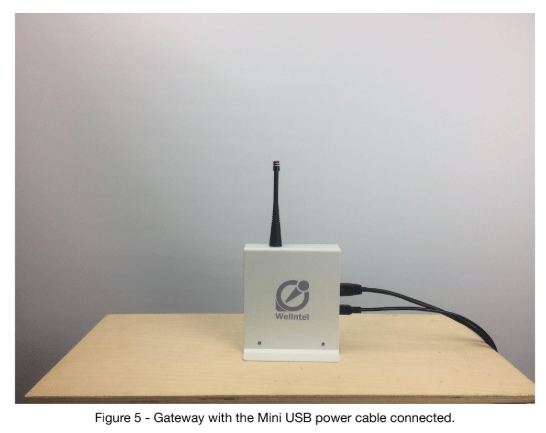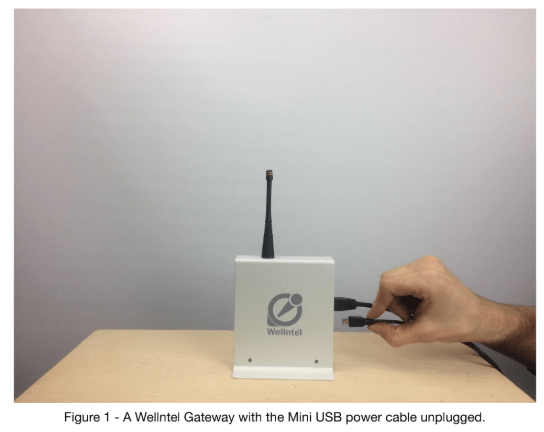 1) Locate your Wellntel gateway. It will be connected to your home internet router. Unplug the Mini USB power cable from the gateway. Leave unplugged for 10 seconds. Make sure to pull USB straight out to protect the device from damage. You can also unplug at the wall outlet (Figure 1)